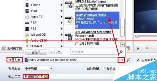 3、打开视频以后点击预设方案右边箭头设置输出的视频格式,然后设置好输出视频的保存位置。