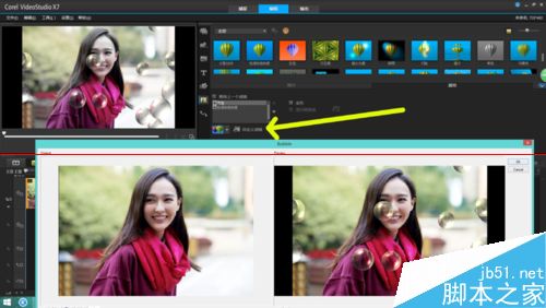 3、单击一个滤镜图标就可以在左边的看到效果简图。此处选择应用"气泡",单击不放并拖动“气泡”滤镜图标到素材图片上,再次单机素材图片,再在预览窗口点击播放可以查看效果。