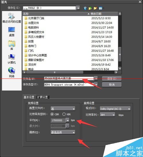 6、打开格式输出对话框,里面可以设置一些蓝光常规的视音频参数,比如我们指定视频码流为17Mbps。画质为最高品质。名字可以自己取,点保存