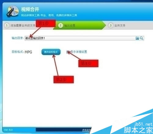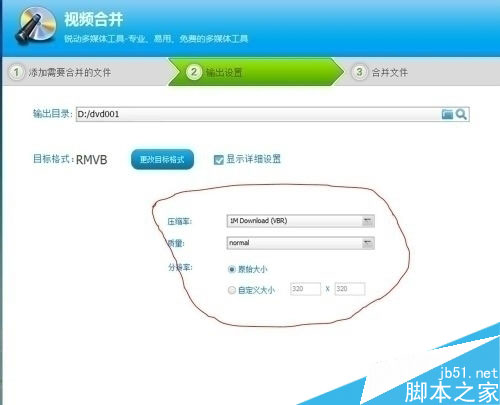 5:进行输出设置,这步最重要啦!分三步走:第一步,设置输出目录;第二步,更改目标格式,这一步小编选择的是RMVB格式的;第三步,勾选“显示详细设置”,之后按图示设置,当然,您也可以自行设置哟!