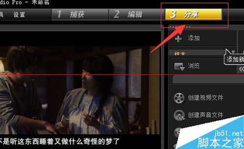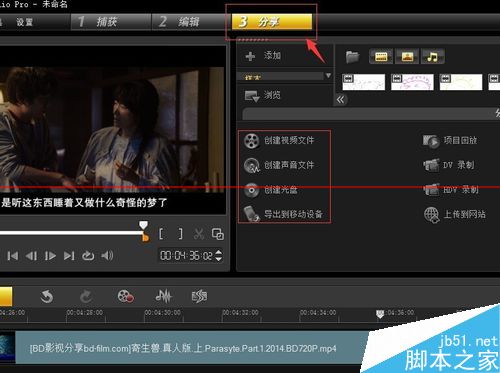 3、在分享界面我们主要是使用左侧的红色方框里面的选项,创建视频文件就是输出视频,创建声音文件就是输出音乐,创建光盘就是刻录光盘,还可以通过导入到移动设备导入到自己的移动硬盘。