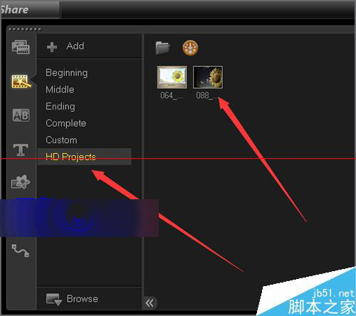 11、当我们点击之后,就可以在它的列表中看到在最下面的HD Projects中,就有我们所下载的模板,我们想要使用它的话,可以直接拉入到轨道中进行使用及素材的替换。希望这会对您有所帮助!