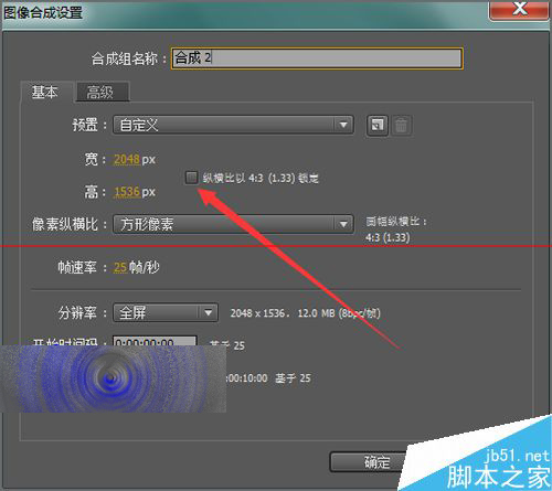 7、击菜单栏中的新建合成,然后在它弹出的图像合成设置中。我们选择自定义。把它的纵横比前面的勾取消掉。然后输入和刚才图片相反的尺寸。把它的宽设置为2048px,高为1536px。然后点击确定。