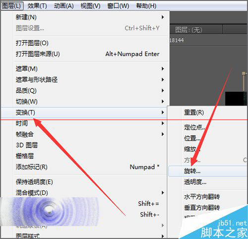 9、如果不习惯使用快捷键的话,我们同样可以在菜单中进行设置。点击菜单栏中的图层。然后选择图层----变换----旋转。接着在它弹出的旋转的界面中把它调整到合适的角度。