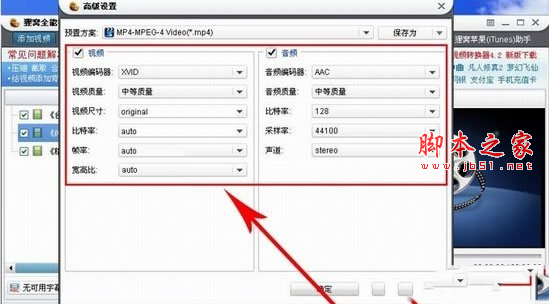 3、选择“预置方案”后面的高级设置,可以对视频的参数进行设置。可根据您的需求选择合适的视频参数;如输出视频编码器、质量、尺寸、比特率、帧率、比例、音频采样率、声道等。