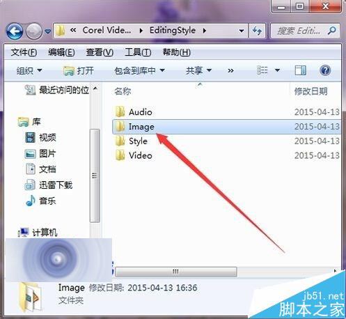 3、点击并打开这个文件夹后,在它的列表中找到Image的文件夹,这个文件夹就是会声会影中的一些图片文件夹。