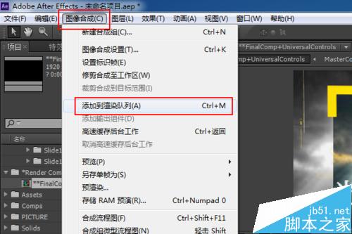 1、处理完成视频之后,我们就可以开始渲染输出一个基本的样稿出来,当然也可以直接输出最终的视频,再菜单栏里面点击“图像合成”,选择“添加到渲染序列”