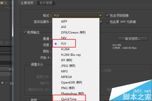 6、点击格式,选择需要输出的视频格式比如这里我们选择H.264,这样输出的时候就是mp4格式的视频了,也可以选择flv或者是quicktime的mov格式