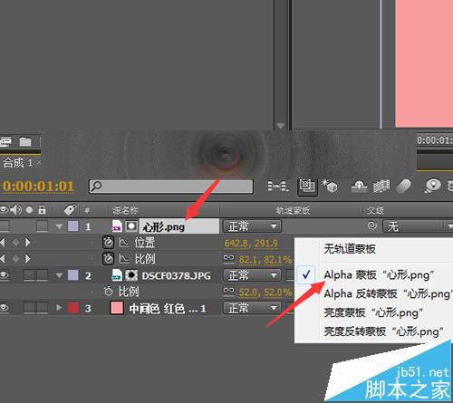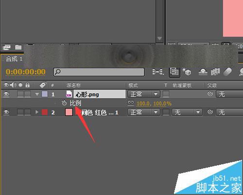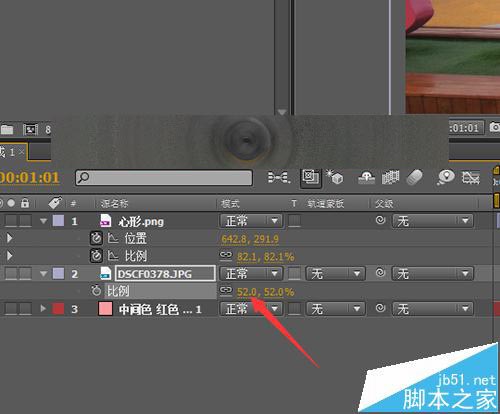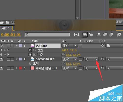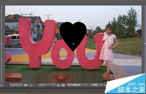 8、调整好之后,就需要导入要制作效果的相片。把相片直接拉入到心形的下面。在处理相片的时候,如果导入的相片过大,就可点击键盘上的s键把它缩放到合成的大小。