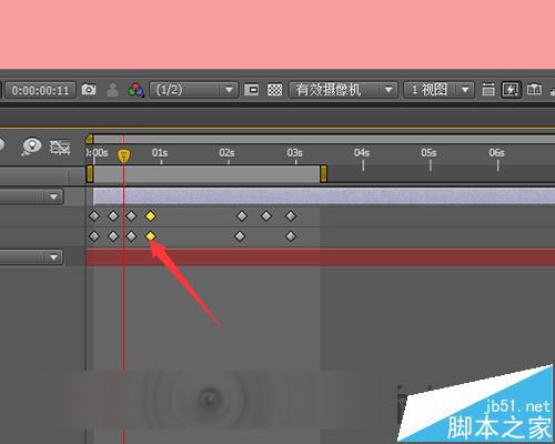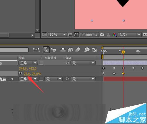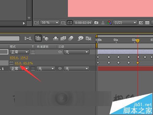 2、接下来就需要看着上面的位置的关键帧来给下面的心形添加缩放值。把时间线移动到位置的第二个关键帧上。在缩放比例上面把它的缩放值调整为45左右。调整之后,就会自动的在缩放上面新建一个关键帧。