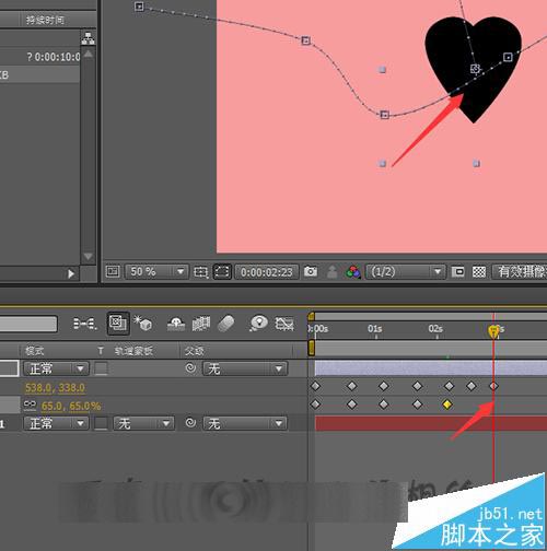 12、在它的位置上面的节点都是可以进行调整。如果觉得它的线条不够柔和的话,直接选中它上面的手柄进行一个调节。让心形的运动效果看起来更流畅。