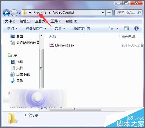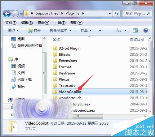 6、打开Plug-ins的文件夹后,在它的列表中找到Video copilot文件夹并打开。打开之后,在它的列表中并没有Optical Flares插件, 就需要在其它的文件夹中继续找。点击地址栏的上面,回到Plug-ins的文件夹。