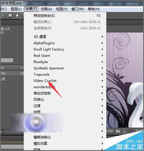 2、这里先要在它的特效列表中找到它是在哪个文件夹中。在软件中新建一个合成,然后随意的拉入一张图片到合成中后,再点击特效菜单。这时在弹出的列表中找到Optical Flares插件的位置。是在哪个文件夹中的,就可以在这个文件夹中找到这个插件。