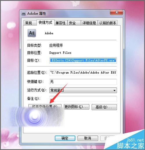 4、在桌面上ae的桌面图标上面点击右键。在它出现的列表中选择最下面的属性。接着在弹出的属性界面中点击打开文件位置。