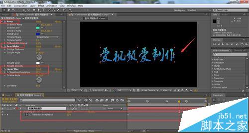 1、首先,新建文字,选择个人喜欢的字体,为其添加个人喜欢的颜色,添加斜角边alpha使其看着更有立体效果。为其添加线性擦除,并对文字做从左往右出现的动画。