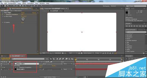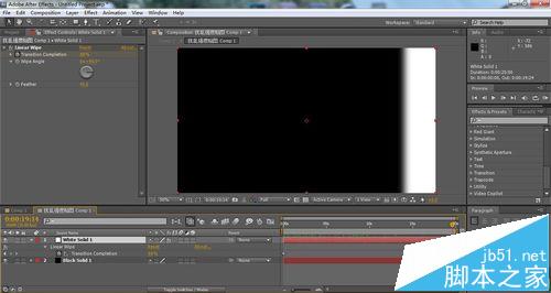 2、然后,新建一个合成来制作控制粒子扰乱强度的黑白贴图。新建一个黑色固态层和一个白色固态层,黑色在下,白色在上,给白色添加线性擦除,为其做擦除动画。使白色从左滑向右(注意配合文字滑向动画的时间,要比文字的滑向动画延迟一点)。