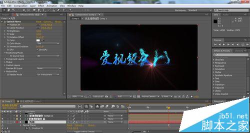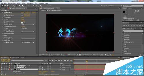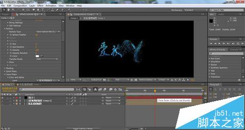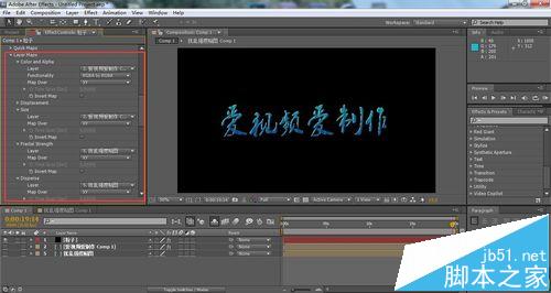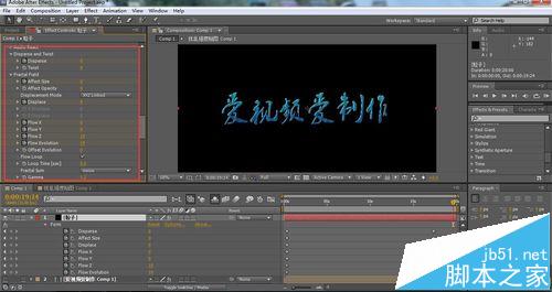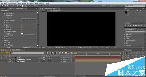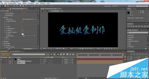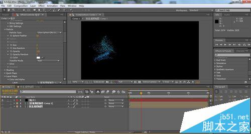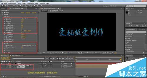 3、然后,再新建一个合成,将上两部做好的文字和黑白贴图,都拖进来,不用让它们显示。新建一个固态层,添加form滤镜,调整form粒子的参数(调整x,y大小的时候可以显示出文字,作为一个参考,调整好再做隐藏),其他参数的调整可以参照截图上的参数,粒子的扰乱是靠disperse和fractal这两个控制的,对其下面的参数做动画,当然这也是配合着黑白贴图进行的(白色的部分就相当于强的部分,黑色的部分就相当于弱的部分,这样你才能看到当黑白贴图走到哪个位置,哪个位置的粒子就慢慢的变成文字了)。