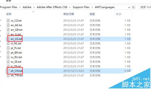 5、当然要注意,zh_CN.txt 和 en_US.txt不可以同时存在,否则AE CC启动会出问题的,或者是软件界面语言根本不变!所以我们要留一个删一个。