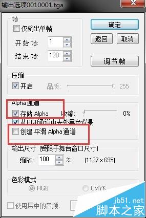 3、在具体的参数方面,我们一定要记得打开ALPHA通道设置,否则我们输出的背景是黑的的,不能正常使用。