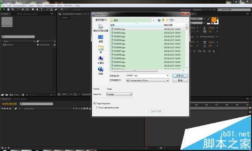 4、把输出的图片序列导入AE。注意一定要是以序列的方式导入。