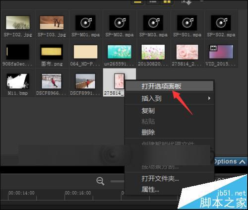 2、直接在素材上面进行操作。在素材面板上面,选择这一张图片。在图片上面点击右键。在弹出的列表中选择打开选项面板。