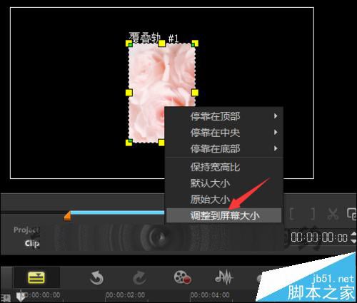 4、在覆叠轨上面进行操作。把素材拉入覆叠轨上面。选中覆叠轨上面的图片素材。在窗口的界面中在图片上面点击右键,在列表中选择高速到屏幕大小。