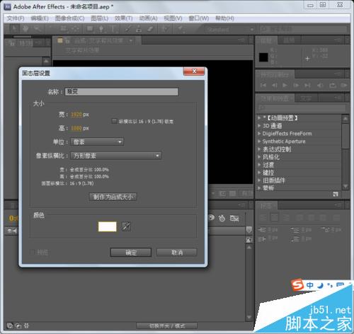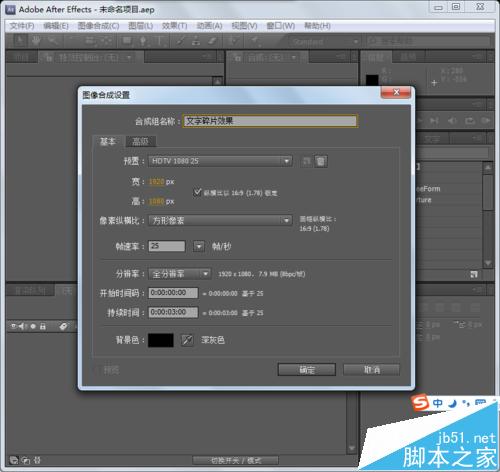 1、打开AE,新建合成。执行菜单中的合成 新建合成命令,打开合成设置对话框,设置合成名字为“文字碎片特效”,帧速率为25,设置持续时间为0:00:03:00.