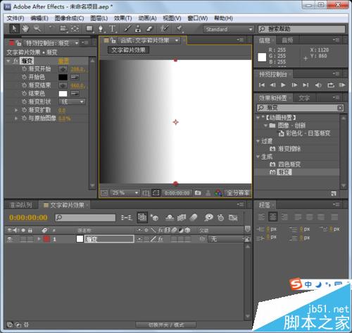 3、添加渐变特效,修改其参数。执行菜单中的特效创造渐变命令, 在对其进行参数修改.设置渐变起始点为渐变结束点为(-14,144)具体参数大家可以根据需要自行调整。