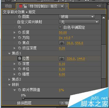 (4) 展开渐变选项,将渐变图层下拉菜单改为2.渐变,设置爆炸极限为0%,将时间线放置零帧(0:00:00:00),点击位置爆炸极限前面的码表,设置关键帧。