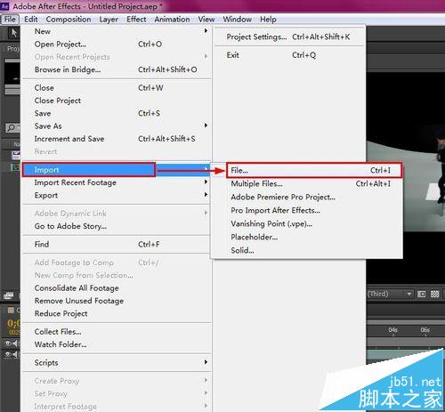 1、使用菜单中的“导入”功能进行导入素材。首先点击菜单栏中的“file”即“文件”选项,弹出菜单选项。