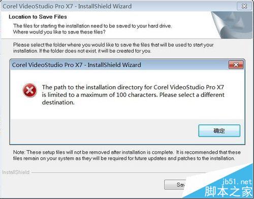 =在会声会影X7安装的时候,尤其是安装64位版本的朋友可能会遇到一种情况,那就是如果指定安装到别的分区的时候,有时候会出现如图所示的错误提示,安装无法进行下去。在错误提示中有两句英文:The path to the installation directory for Corel VideoStudio Pro x7 is limited to a maximum of 100 characters. Please select a different destination。意思是说:会声会影X7支持的安装路径限制在100个字符内,请选择别的路径安装。也就是说,选择的安装路径超过了100个字符的限制,因此就无法安装了。