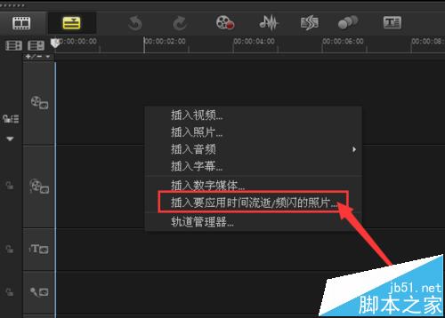 2、打开会声会影X7软件,鼠标在轨道上右键,弹出一个菜单,点击插入要应用时间流逝/频闪的照片,如图所示。