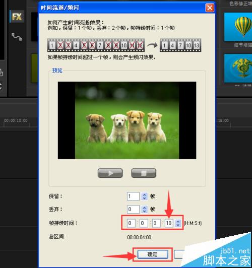 4、这时会弹出时间流逝/频闪窗口,我们把原来的帧持续时间1帧,改成10帧,然后点击确定,如图所示。