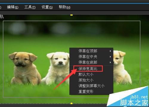 6、点击第一张图片,点击选项,把变形素材前面的方框打勾,然后鼠标放在屏幕上右键,在弹出的菜单中点击调整到屏幕大小,然后再右键,再次弹出菜单,点击保持宽高比,如图所示。