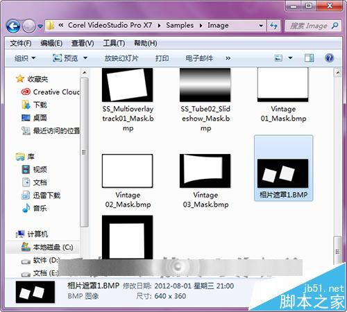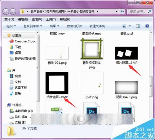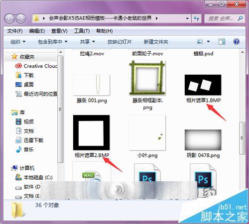 1、打开下载的会声会影模板。可以看到在这个模板中有一些bmp格式的遮罩素材。这些遮罩是在制作图片或视频效果时会添加使用。这里也需要把模板中的这两个遮罩添加到软件的遮罩文件夹中。