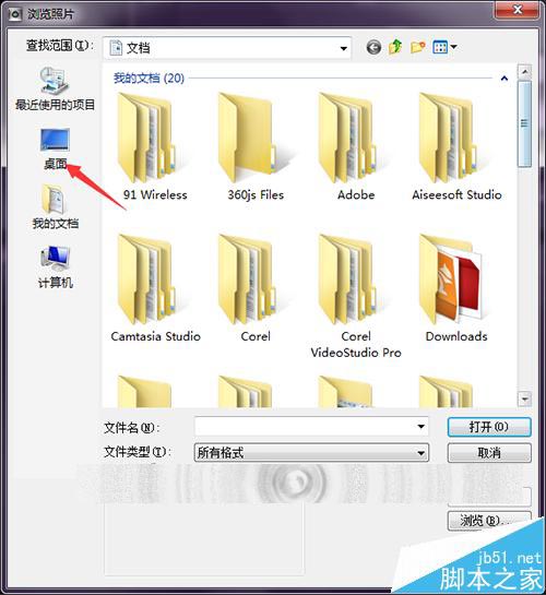 5、这时,在弹出的浏览图片的界面中默认的是打开文档。这里就需要根据自己下载的模板所放的位置来进行打开。这里直接把模板放到了电脑的桌面上,直接点击左边的桌面。