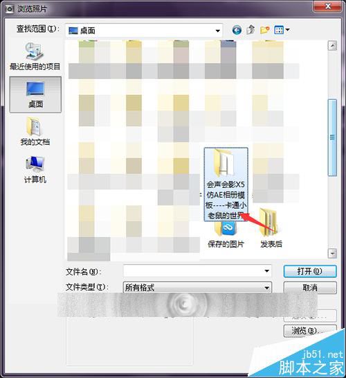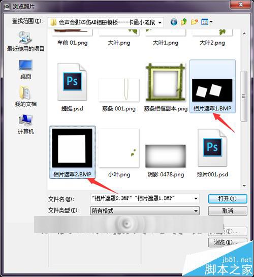 6、在桌面上找到这个文件夹后,双击进行打开。在模板的列表中找到要添加的这两个文遮罩图片。这里可以直接进行多个选择的添加,不用再添加一个后再重新的点击添加另一个。键着键盘上面的ctrl键选择要添加的遮罩。然后选择打开。