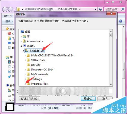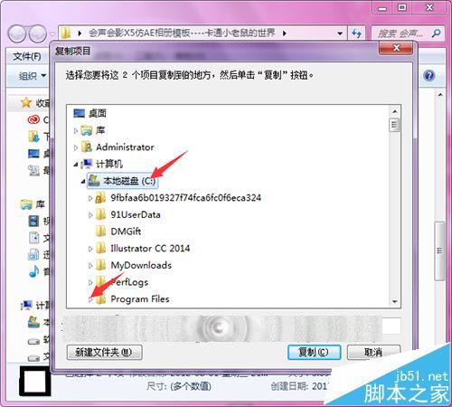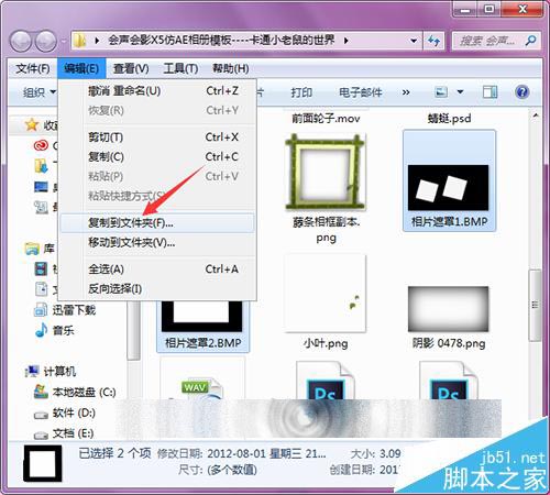 9、除了上面直接通过遮罩中的加号来添加遮罩之外,这里也可以直接把添加好的遮罩素材放到会声会影软件的安装目录的遮罩文件夹中。这样就箕模板丢失,还可以直接在软件目录中找到想要的遮罩。在遮罩文件上面点击复制到文件夹。