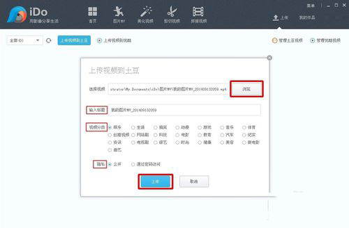 上传到土豆:点击【浏览】找到你刚刚制作好的MV视频==》填写【标题】==》选择【分类】设置==》【隐私】==》然后点击【上传】。