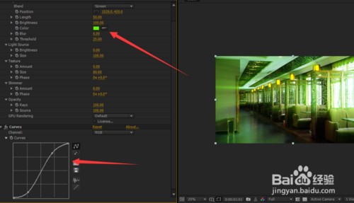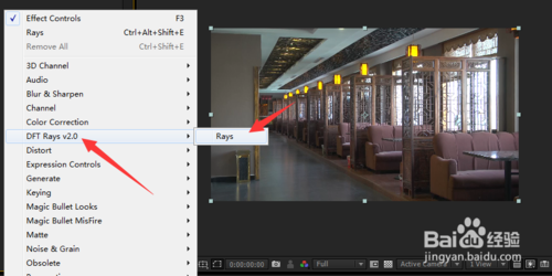 5、我们找到适合做光线的素材,在特效面板上选择DFT Rays——rays,选择之后我们就可以看到效果了,我们在调动上面的参数,让他达到你想要的效果!