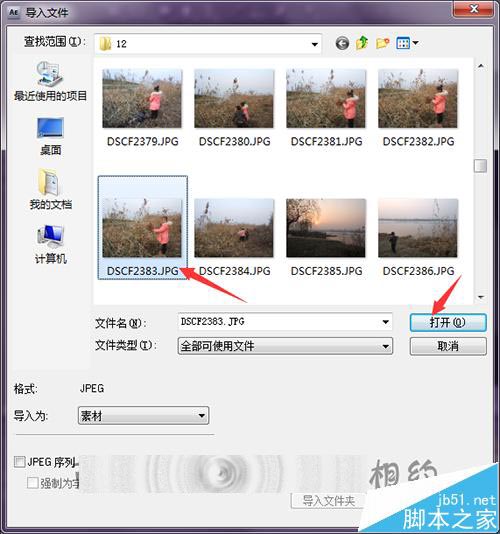 3、导入相片或图片。在项目面板中点击右键,选择导入——文件。在打开的导入文件的界面中选择想要处理的相片后,点击打开。