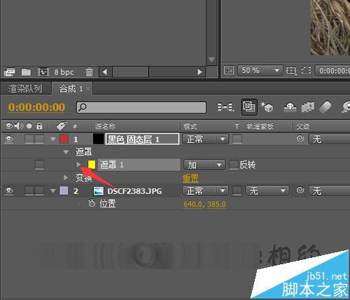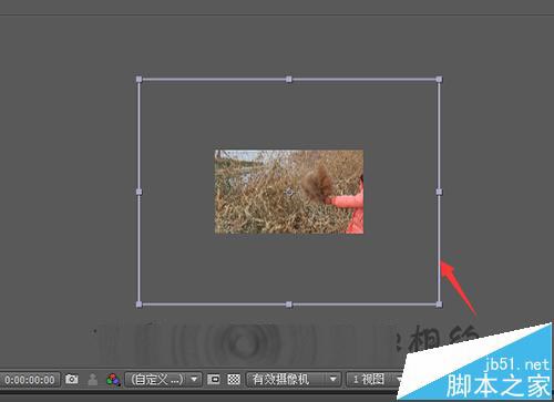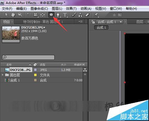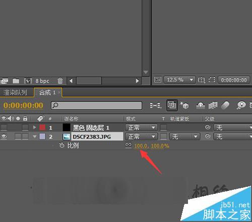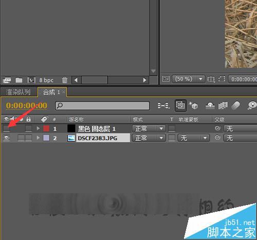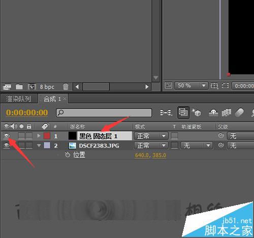 4、直接把相片拉入到下面的合成中。把相片放到固态层的下面。先把固定层关闭后需要看一下相片的大小是否合适,如果相片过大的话,就需要把相片进行一个缩小的操作。