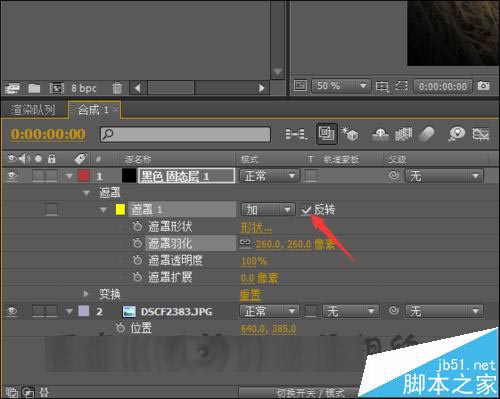 9、当调整数值后,可以在预览窗口中看到现在它的位置是在中间,并不是想要的效果。这里点击遮罩后面的反转。把它的位置和原来的正好相反。