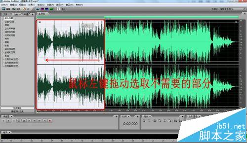 3、通过鼠标左键拖选音频不需要的部分,并按Delete删除所选。你也可以通过鼠标右键弹出选项,选择剪切来删除所选定的音频。