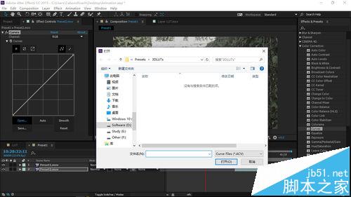3、在调整图层上添加“应用颜色LUT(Apply color LUT)”效果,这时会自动弹出导入预设的对话框,我这里为了方便演示,暂时先关闭对话框。