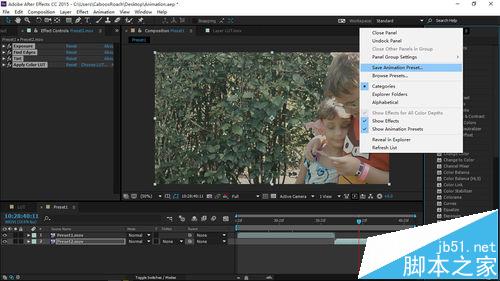 2、按住Shift键点击最后一个,再点击第一个选中所有效果。在“效果和预设(Effects & Presets)"面板打开更多选项,点击“保存动画预设(Save Animation Preset)”保存调色组预设。