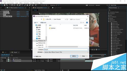 3、弹出对话框,进入AE的预设目录,保存预设文件为“Roach”。