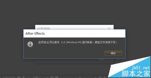 2、双击之后会出现弹窗。【如图】直接点确定即可。汉化和英文版的ae都是一样的,点确定即可。