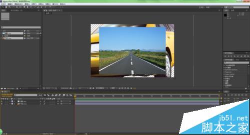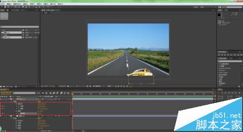 4、将我们的素材“汽车”放置合适位置,将位置、缩放、透明度全面的小时钟点击下去,点击下去之后就可以记录汽车下一位置并在中间自动生成移动的帧。点击之后将汽车拖动至需要的位置并调节汽车的大小、透明度即可。如下图: