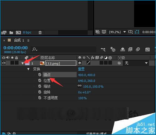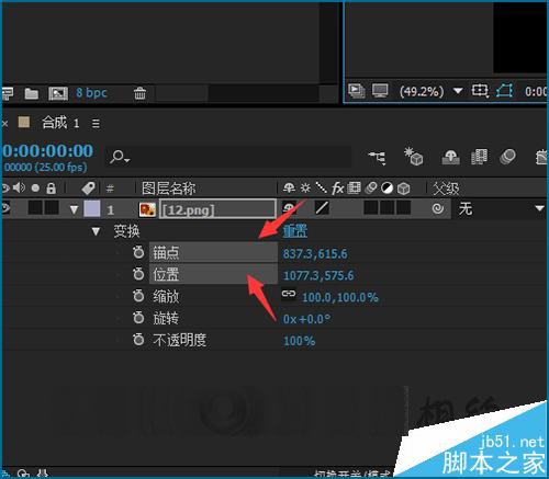 7、移动之后,就可以在素材的属性列表中看到现在是同时选中了锚点和位置。因为在移动素材的锚点同时,素材的位置也跟着发生了变化。接下来就可以来调整一下它的缩放值。